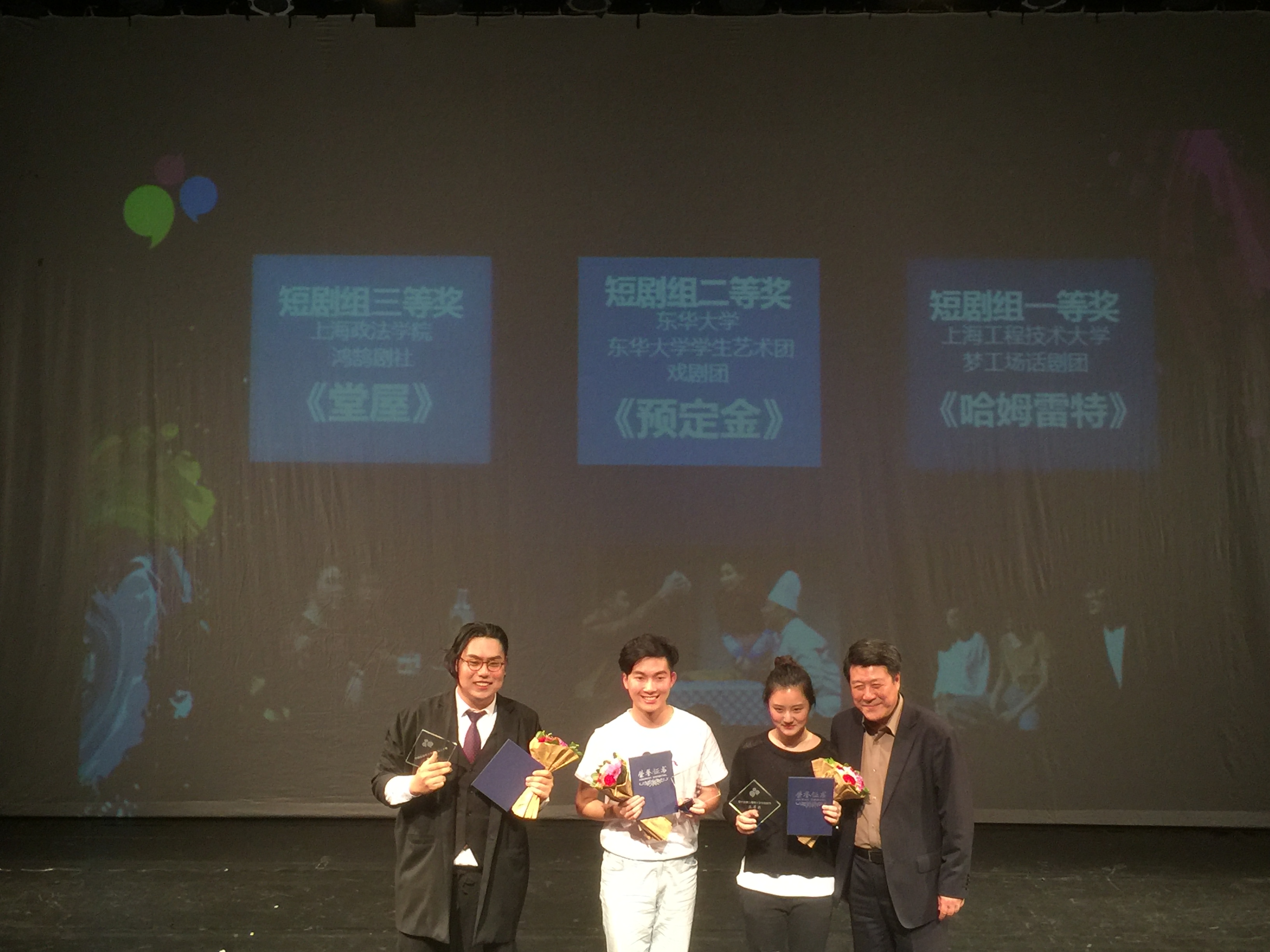 5月22日,从第十三届上海市大学生话剧节颁奖典礼上传来消息,我校学生艺术团戏剧团表演的原创短剧《预定金》从46部作品中脱颖而出,荣获短剧组二等奖,该短剧男主角、信息学院赵剑男同学荣获优秀表演奖,我校荣获优秀组织奖。